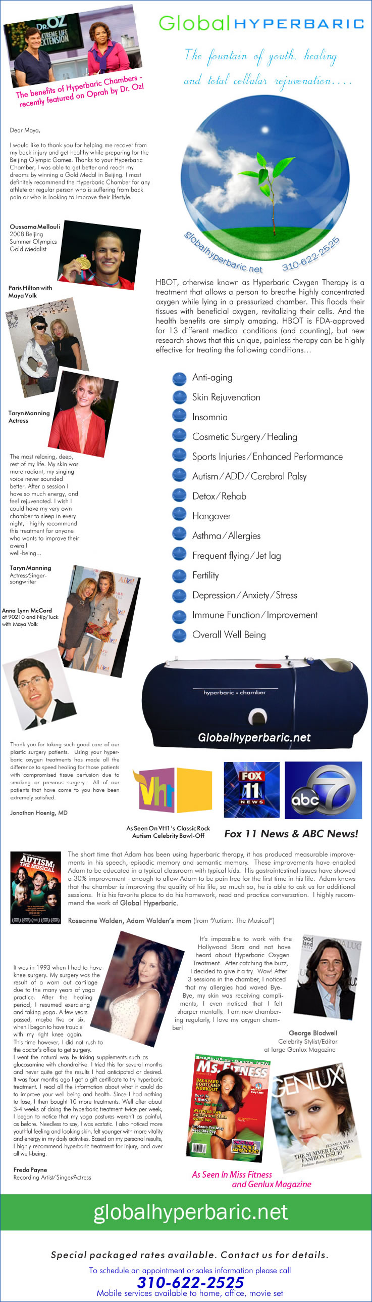 Global Hyperbaric * Maya Volk * 310-622-2525 - Mobile Services Available / Oxygen Treatment